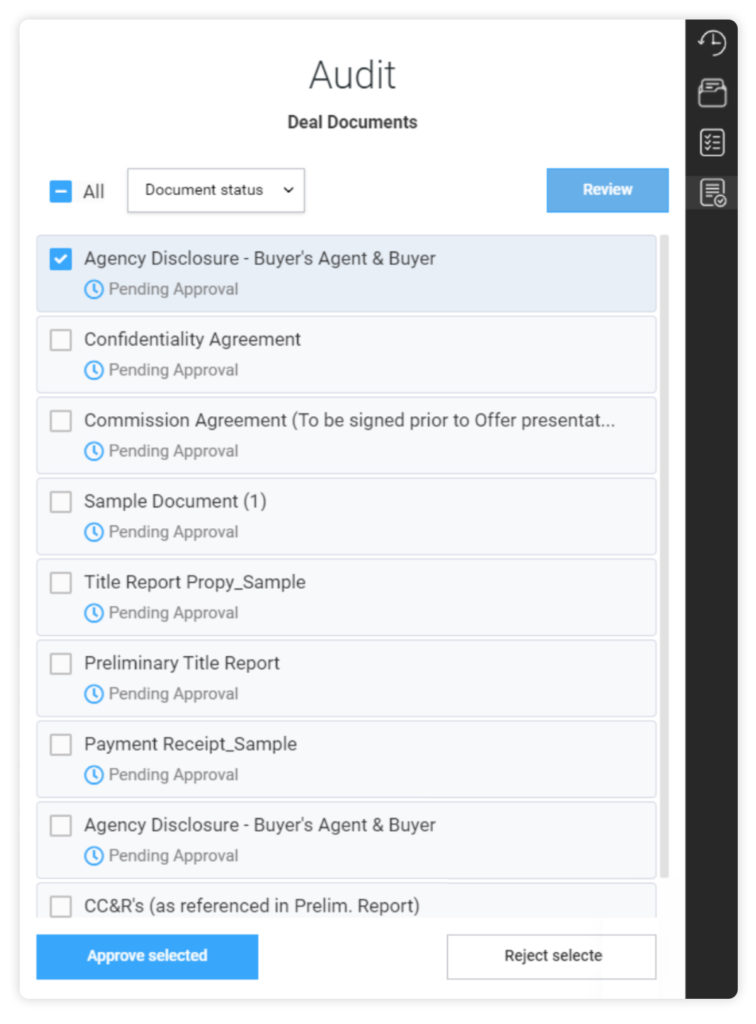 Until now, Propy’s Audit Documents feature was available within each transaction, v.s. documents listed on one screen. All documents uploaded within the transaction were stored there and could be reviewed, accepted and rejected.