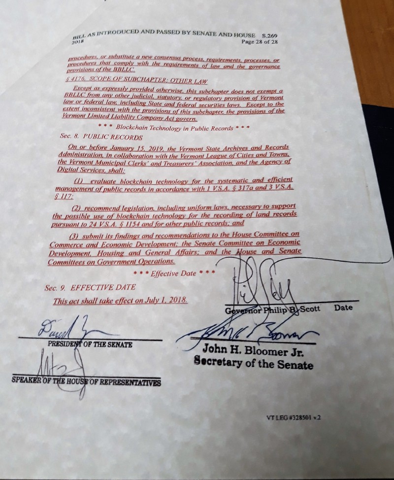 On May 30, 2018, Vermont passed legislation to use blockchain technology to effectively manage its public records in accordance with the existing legislation pertaining to safety, privacy, and security. This law that came into effect on July 1,